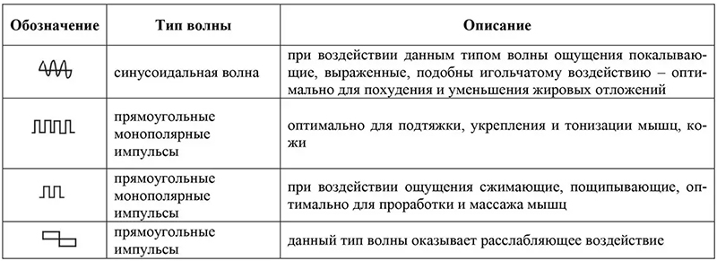 В аппарате предусмотрено 4 типа волны, которые отличаются своим предназначением: для устранения жировых отложений, для подтяжки и тонизации мышц, эффект массажа и релакс-режим. Более детально смотрите в таблице