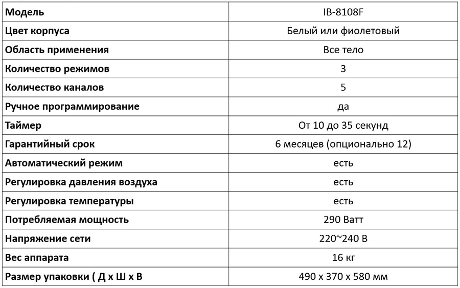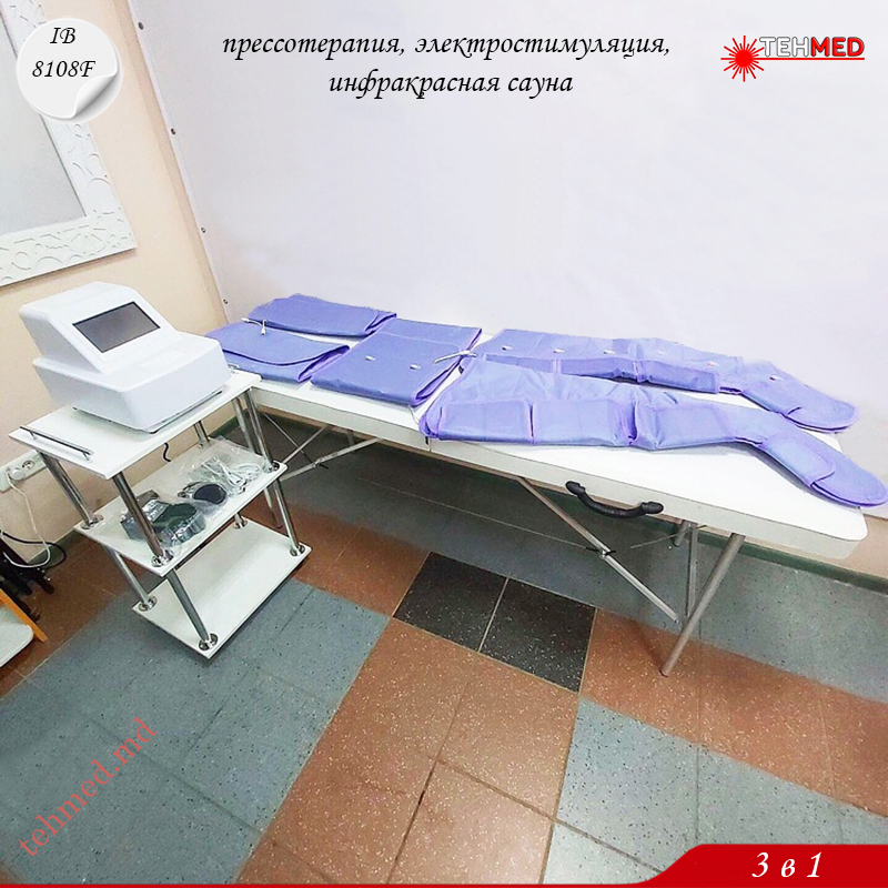 IB-8108F (3 в 1) содержит в себе 3 основных функции: прессотерапию, инфракрасную сауну и электростимуляцию. IB-8108F был разработан в результате исследований в области бионики человека. В одном аппарате заключены функции растворения расщепленного жира, лимфодренажа, магнитотерапии, возвращения упругости коже и использует высокотехнологичные средства для массажа,электротерапии и терапии давлением, чтобы получить значительный эффект.
