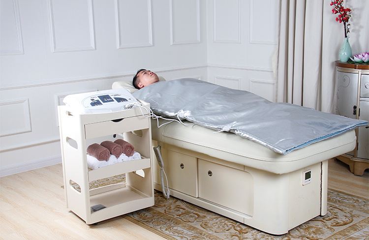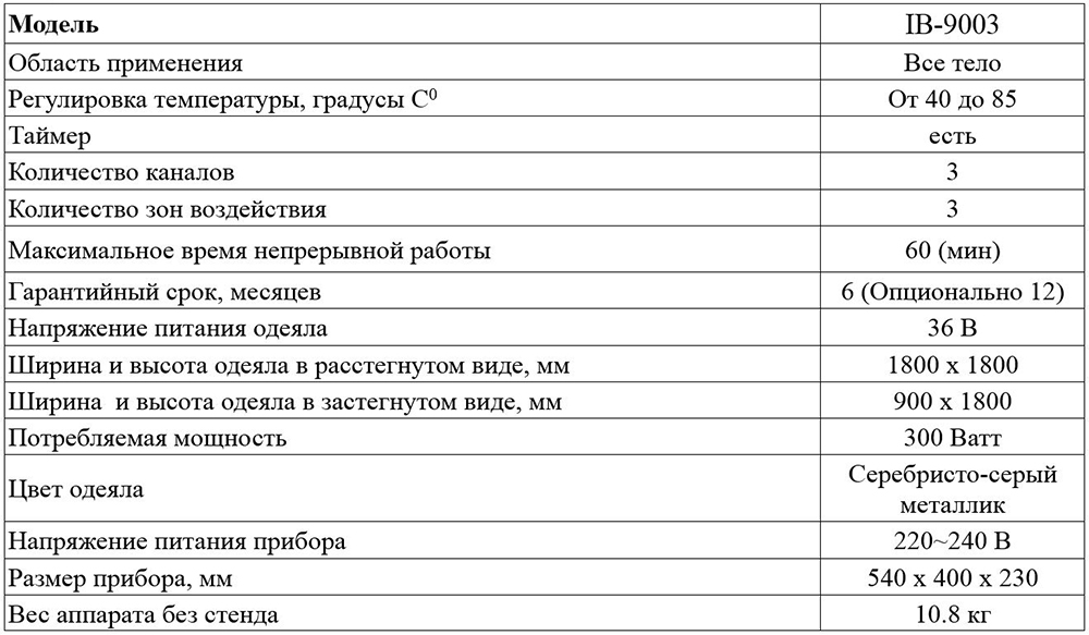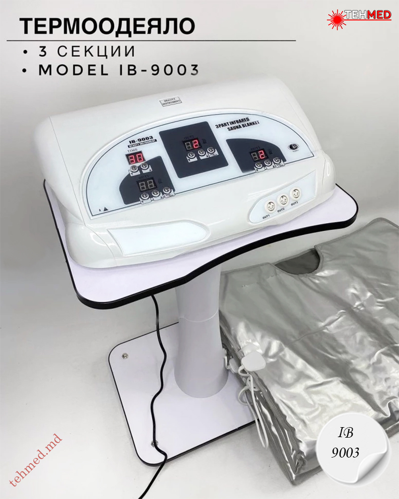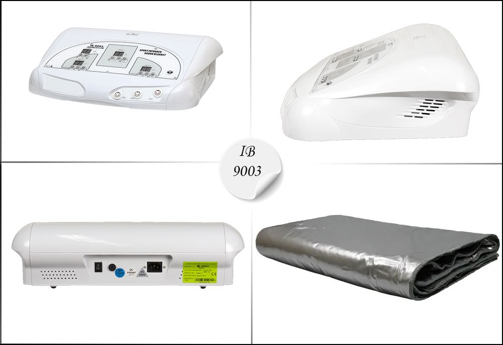 Для поддержания тела в форме существует много разных способов: физические тренировки, правильное питание, процедуры в салонах красоты. Одним из таких способов является инфракрасная сауна. Глубокий прогрев всего тела, стимуляция кровообращения, улучшение потоотделения, вывод токсинов, расслабляющее воздействие и улучшение эффекта процедуры обертывания это список видов воздействия IB-9003 на организм. Одеяло имеет трех-секционную конструкцию на молнии. Для каждой из 3-х зон можно настроить свой режим работы. Такая конструкция позволяет для каждого клиента подобрать индивидуальную программу по уменьшения количества жира на животе, талии и ногах. Для каждой зоны можно установить свою температуру и время воздействия. Температуру можно установить в диапазоне от 40 до 85 градусов. Напряжение питания одеяла 36В (безопасное напряжение).Одеяло прибора является водонепроницаемым. Прибор имеет небольшие размеры и не требует много места для установки. Это особенно актуально для салонов красоты имеющих небольшую площадь. Специальная поверхность позволяет легко мыть и обрабатывать его.