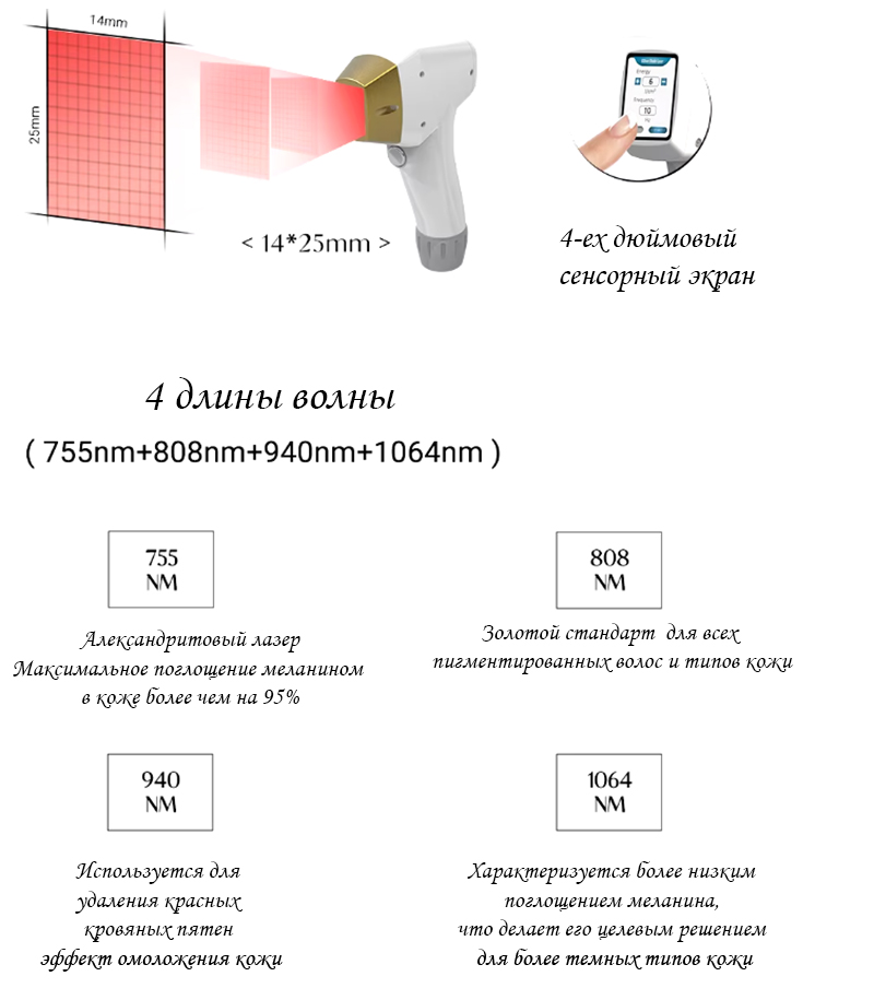 На основе 3 длин волн добавляется 940 нм. Многочисленные клинические испытания могут эффективно удалять волосы на теле и лечить покраснения кожи одновременно. Улучшает омолаживающий и отбеливающий эффект кожи. Кроме того, в аппарате использовано сварную стабильную конструкцию из драгоценного золота, что увеличивает срок службы лазера.