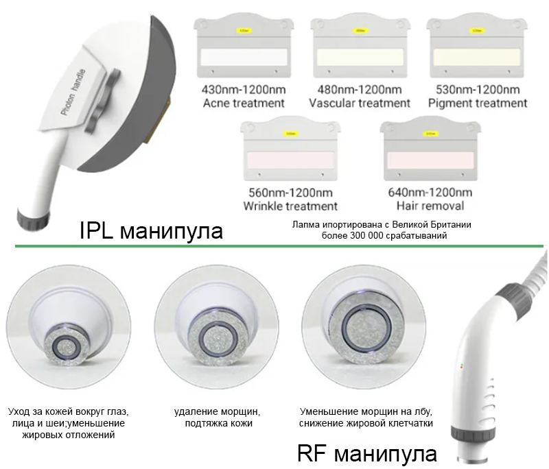 Длина волны IPL: 480, 530, 590, 640, 690–1200 нм