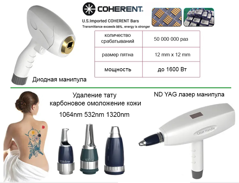 Быстрое удаление волос на всем теле, удаление морщин, фотоомоложение, отбеливанию кожи и удалению татуировок, карбоновый пилинг. Все это можно делать на данном аппарате